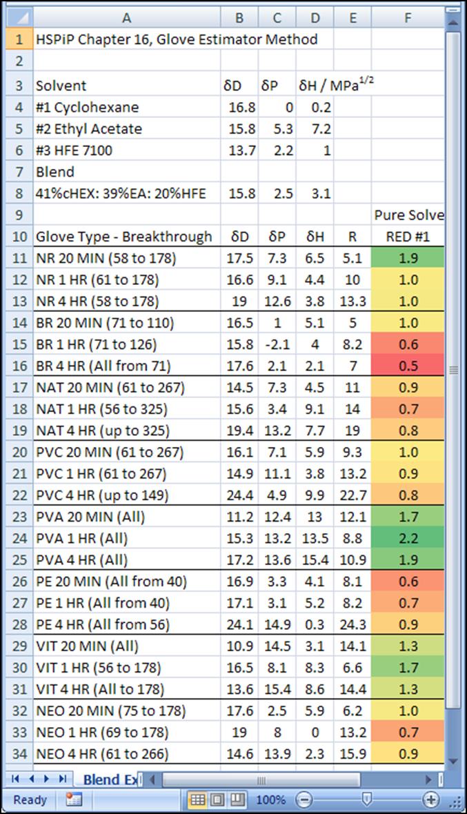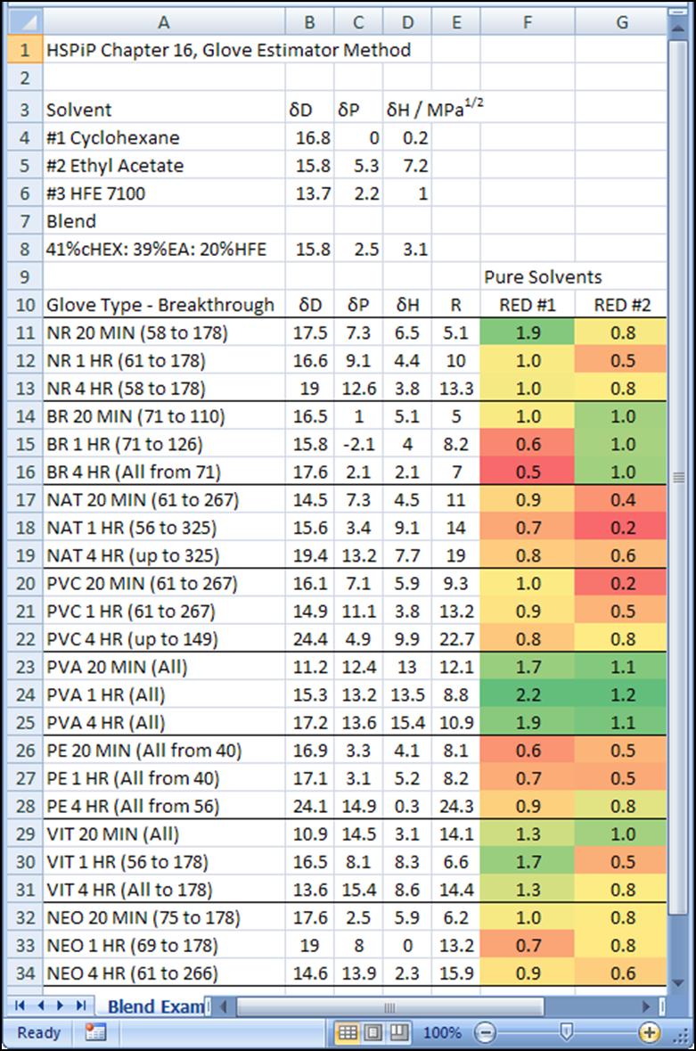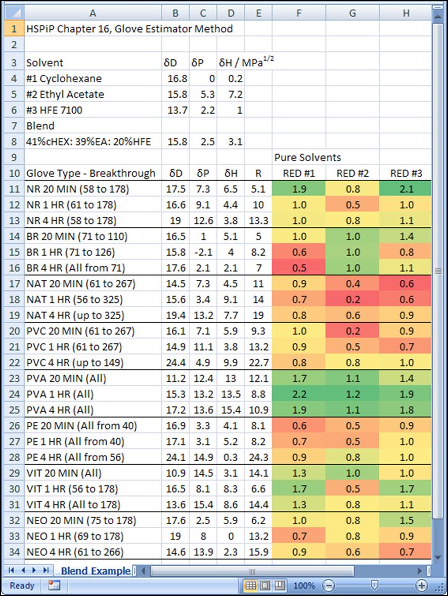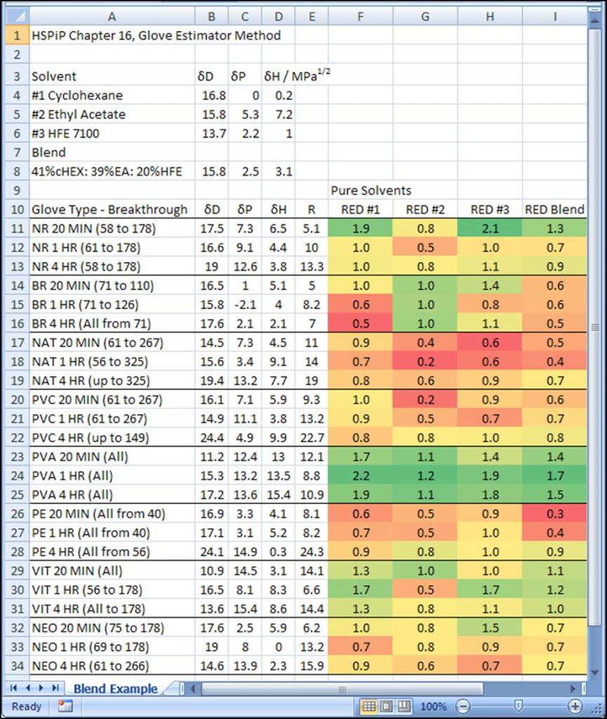 The “better way” I mentioned earlier uses the relative energy difference (RED). Refer to the glove material table above. It has a column labelled R which is the interaction radius of the polymer. These gloves interact significantly with solvents whose HSPs are within this radius. The RED is the distance of the solvent or blend divided by the polymeric material radius. A large RED means minimal interaction. The conditional formatting tool in Excel 2007 can be used to give a very nice visual result (Figure 1). For pure cyclohexane, the polyvinyl alcohol gloves would be the best choice, and the nitrile gloves would work for short exposure or double-gloved splash protection.