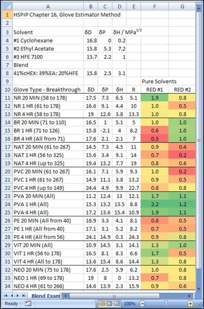 Table 2 gives you information about the gloves. A table of HSPs for the solvents is all you need to find the glove compatibility. The HSPiP software contains the HSPs for over 10,000 solvents and substances.