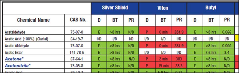 Table 1: Chemical compatibility chart for selecting hand protection. The evaluations depend upon degradation (D), breakthrough time (BT), and permeation rate (PR). Both references explain these in detail, but the color code is obvious – green is good.